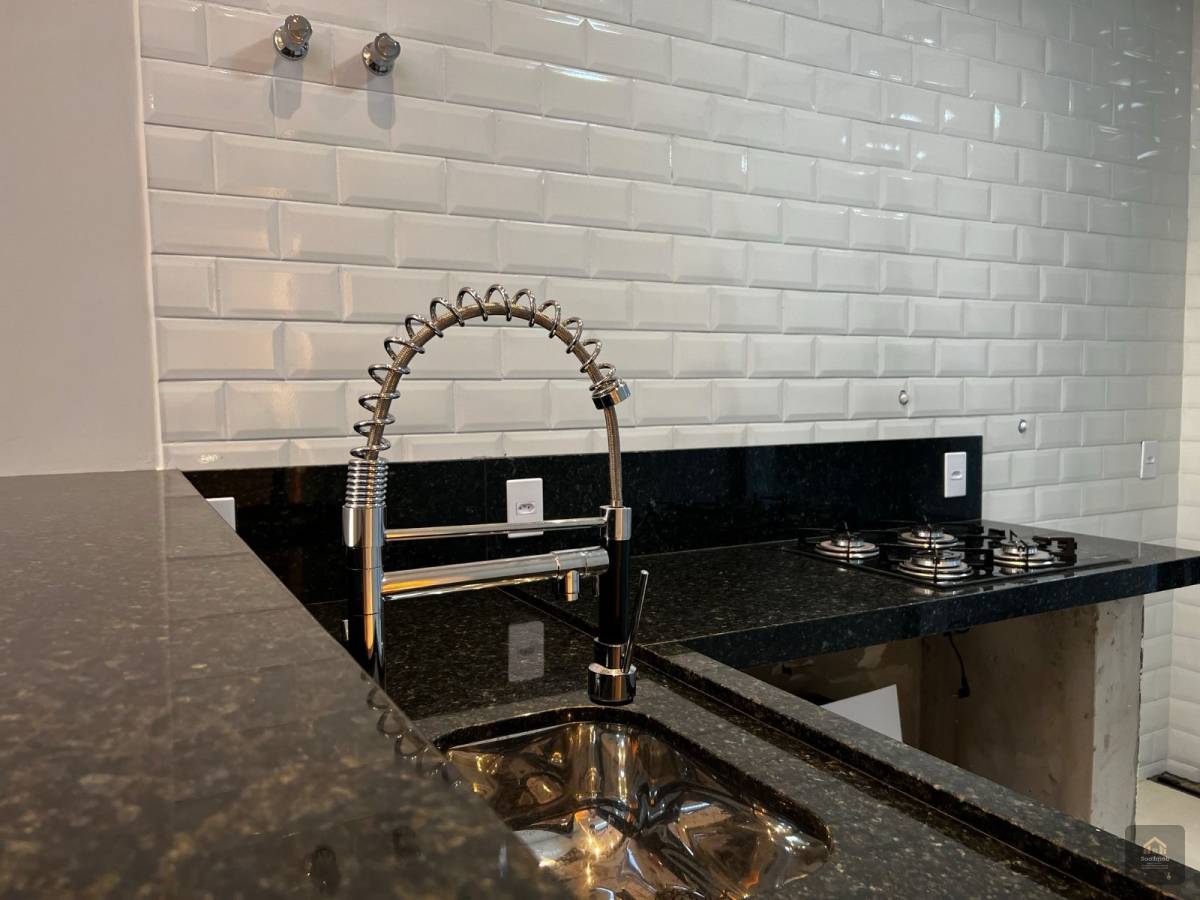 A cozinha, com balcão de granito em L com Cooktop, é integrada à sala de estar e jantar, proporcionando um ambiente amplo e aconchegante.